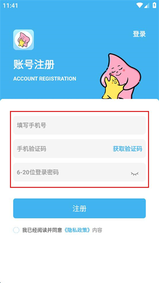 3、在账号注册界面的输入框中,依次填写手机号、手机验证码和登录密码信息。