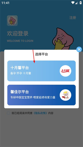 1、进入软件欢迎登录界面,找到右上角的注册选项,点击该选项进入平台选择页面。