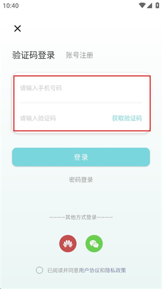 3、在验证码登录界面的输入框中,依次填写手机号码和对应的验证码,准备完成登录信息填写。