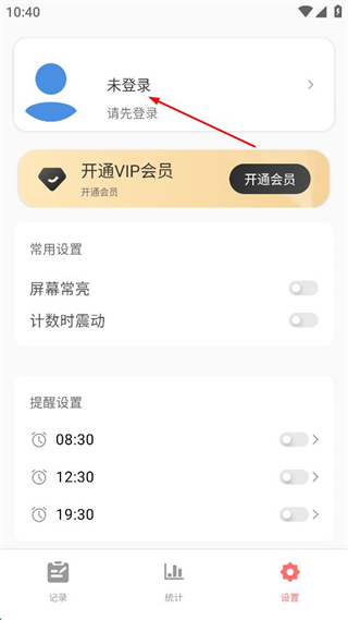 2、在设置页面看到未登录标识,点击该标识进入软件的验证码登录界面。