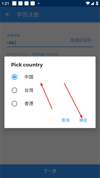 2、在注册页面的地区选择弹窗中,选定中国后点击确定,返回填写信息页面。
