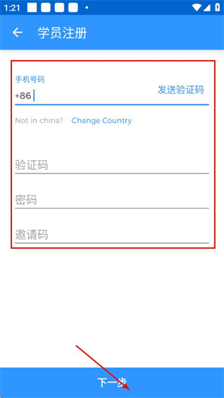3、填写手机号码、获取并输入验证码、设置密码,点击下一步完成注册。