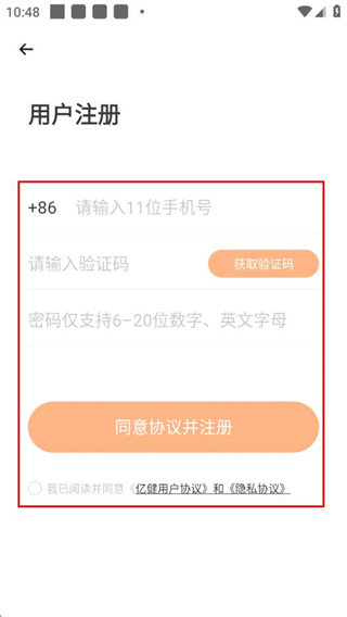 1、打开亿健APP,在用户协议与隐私政策弹窗中勾选同意,点击同意并继进入登录注册页面。