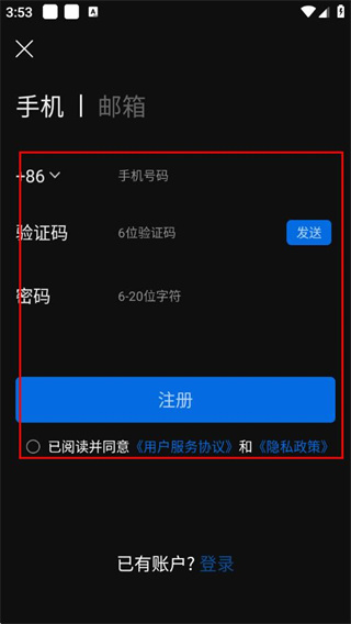 4、填写手机号、获取并输入验证码、设置密码,勾选协议后点击注册。