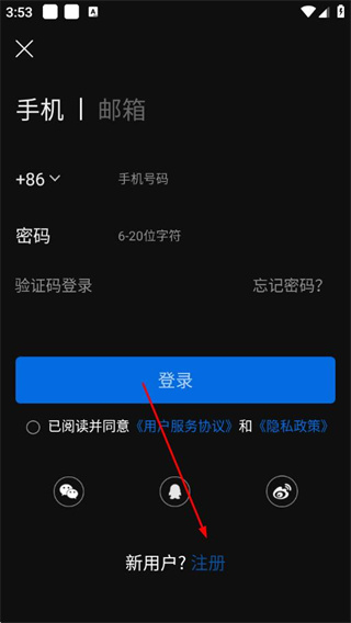 3、在登录页面选择注册,进入注册页面。
