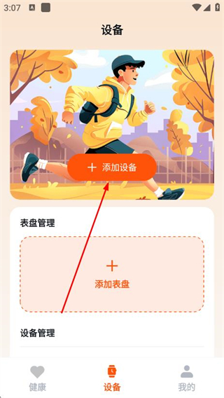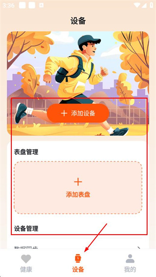 2、在设备页面支持添加智能穿戴设备、管理表盘样式,实现APP与硬件的连接及个性化设置。