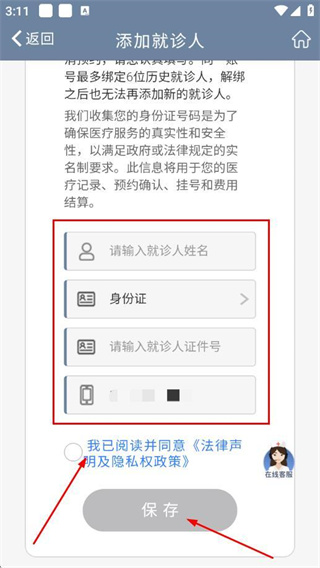 3、在填写姓名、身份证等信息,勾选同意协议后点击保存,完成就诊人添加。