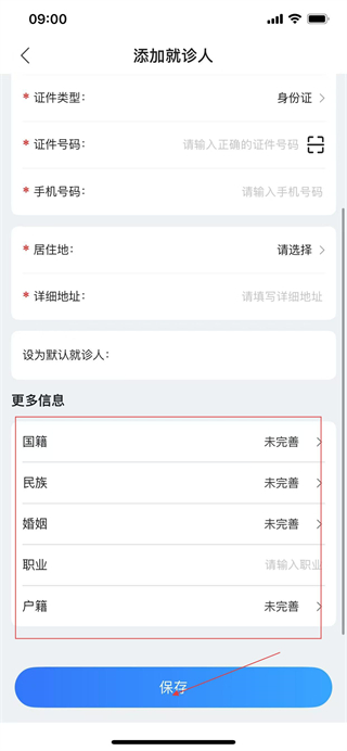 5、完善更多信息,填写完成后点击保存,即可完成就诊人添加操作。
