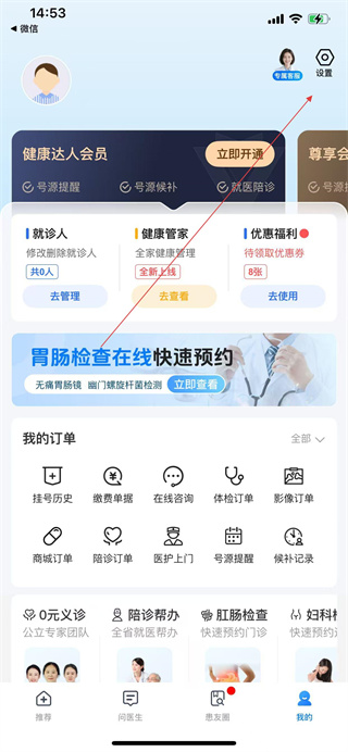 2、进入个人页面后点击就诊人板块的去管理按钮。