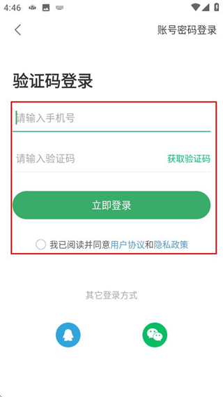 3、在验证码登录页面,填写信息并勾选协议后,点击立即登录完成账号登录。
