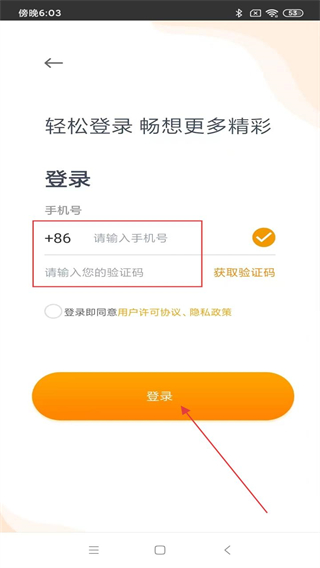 3、在登录的页面内,输入手机号、验证码,再点击登录的按钮。