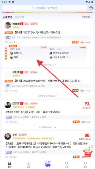 3、赛程界面,点击相关场次可在预测页查看比赛相关推荐,查询即将进行比赛以及正在比赛的赛程。