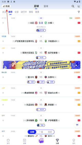 2、进入比赛的界面内,选择足球比赛并点击左上角数据的按钮。