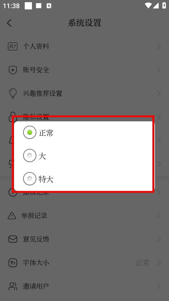 4、在弹出的字体大小选择框中,选择正常、大或特大,即可完成字体大小的修改。