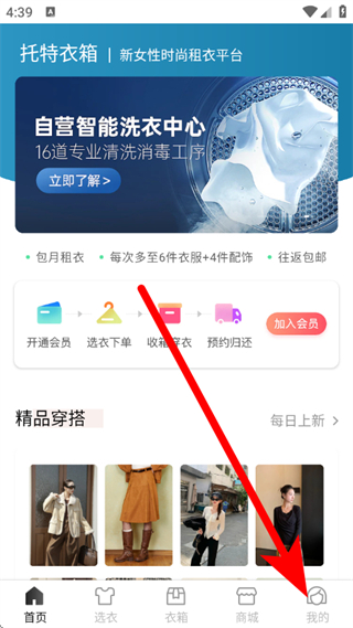 1、打开托特衣箱,点击底部的我的,进入我的页面。