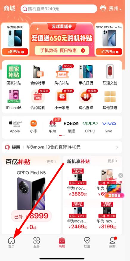 1、打开中国联通app,点击底部导航栏首页。