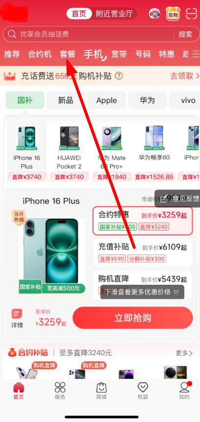 2、在首页中,然后就需要找到并点击套餐选项。
