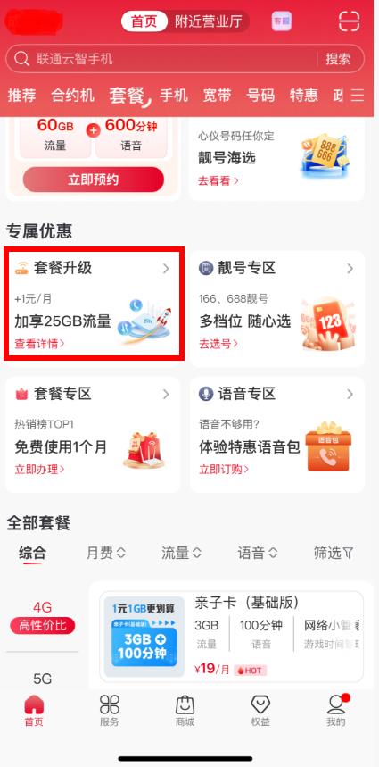 中国联通app怎么升级套餐