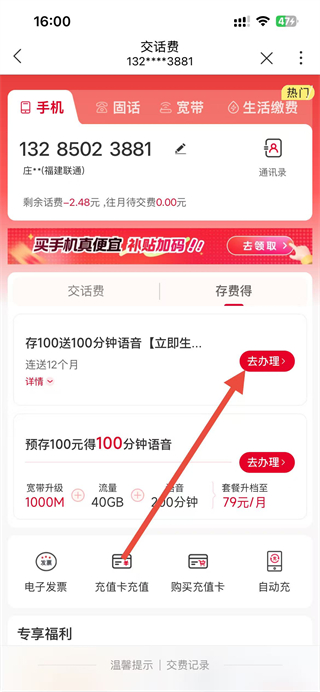 中国联通app怎么办理存费业务