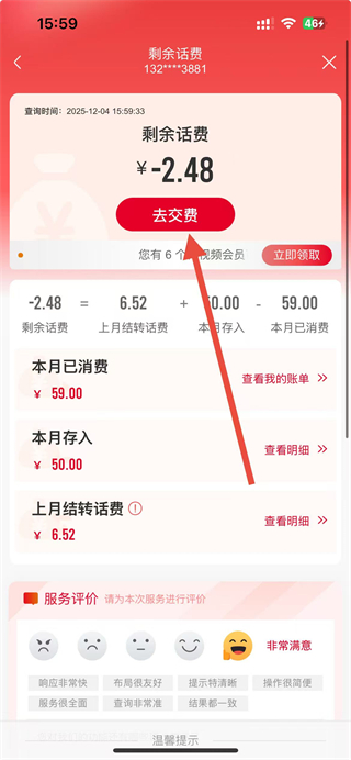 2、进入剩余话费页面后,点击去交费按钮,跳转至交话费的具体操作界面。