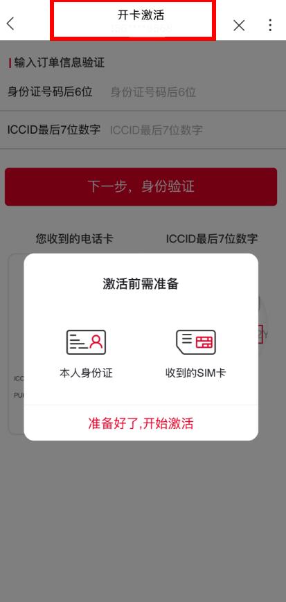 3、进入开卡激活界面,按提示输入身份证号码后6位以及ICCID最后7位数字,点击下一步,身份验证。