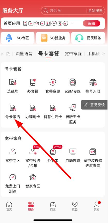 2、进入服务大厅页面后,在号卡套餐分类下,点击号卡激活选项。