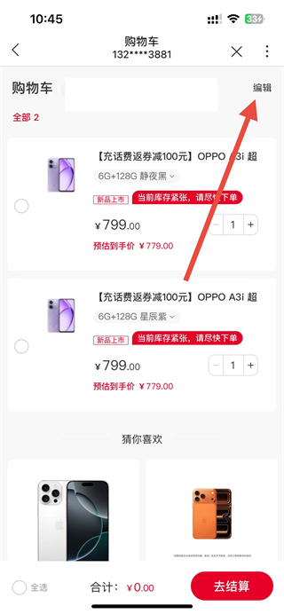 3、在购物车页面点击编辑选项,进入编辑模式。
