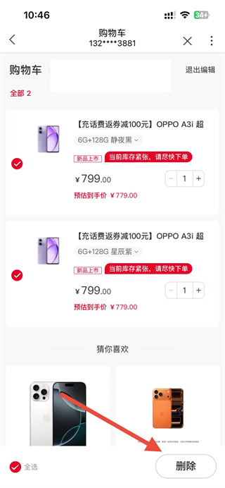4、在编辑模式下选择要删除的商品,点击删除按钮,即可删除购物车商品。