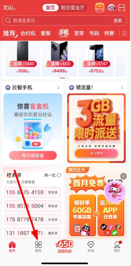 1、打开10010联通网上营业厅APP,点击底部导航栏中的服务。
