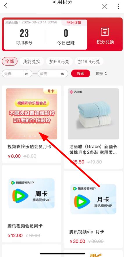 3、进入可用积分页面后,浏览可兑换商品,点击想要兑换的商品,如视频彩铃乐酷会员月卡,按提示完成兑换操作。