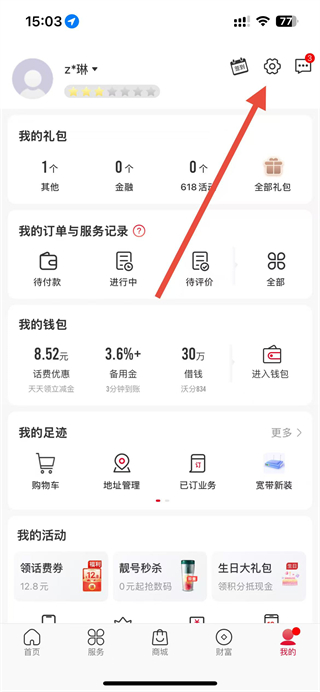 1、进入app后,在我的页面点击右上角齿轮形状的设置图标。