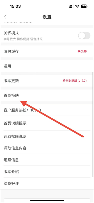 2、进入设置页面后,找到并点击首页换肤选项。