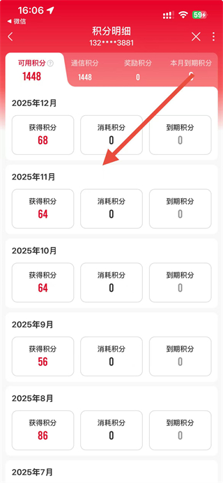 3、在积分明细页面,可查看不同月份的积分数据,清晰了解每月积分变动情况。