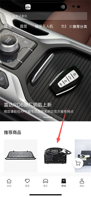 1、在吉利雷达首页,点击底部的商城选项,进入商城页面。