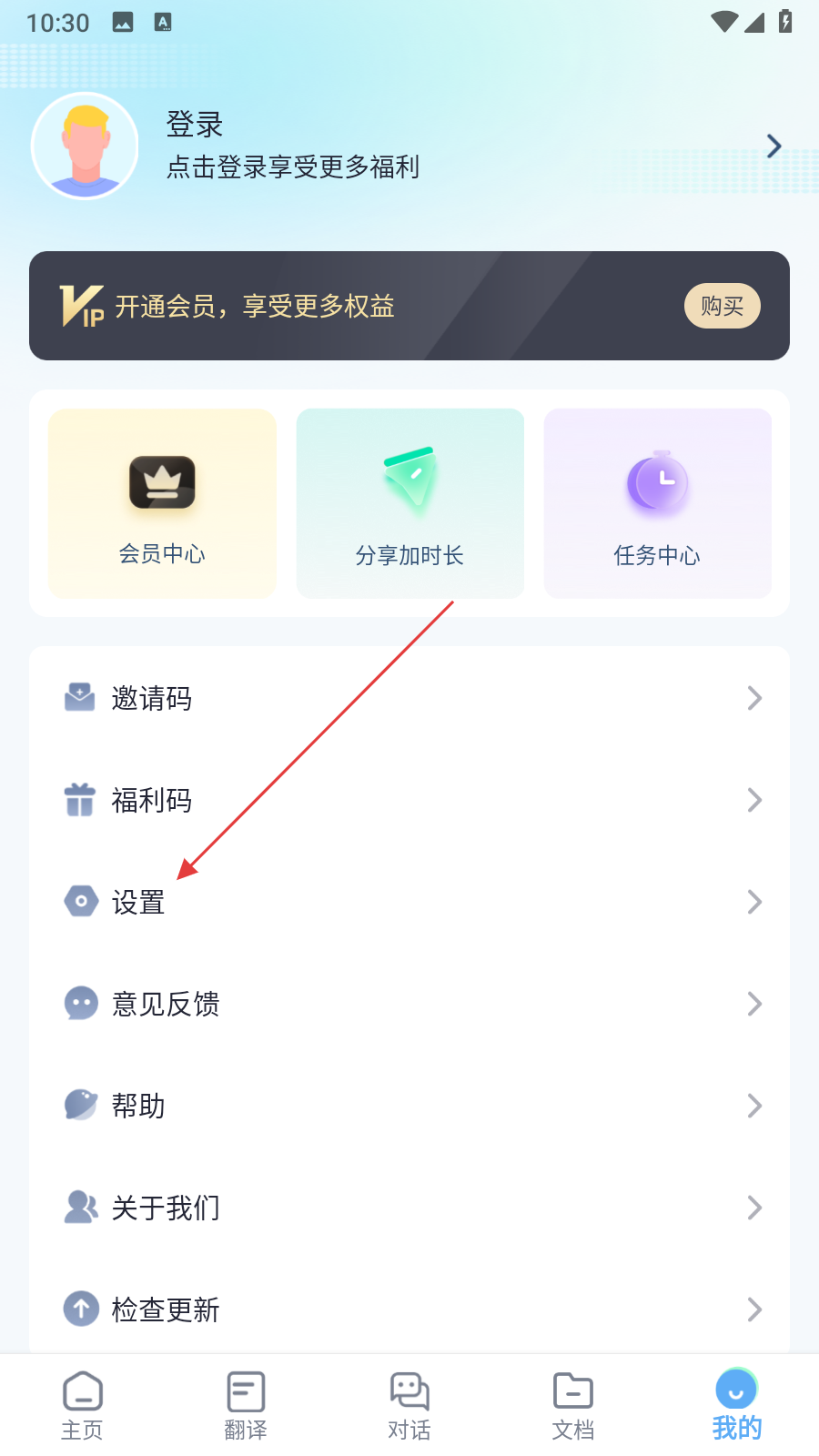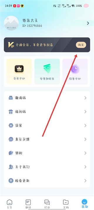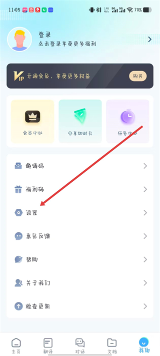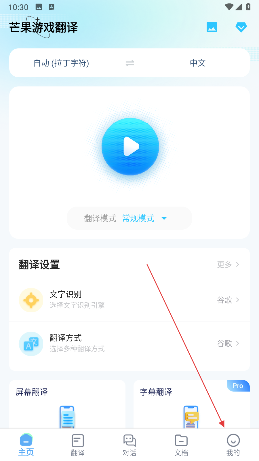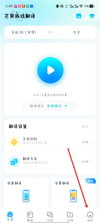 1、打开芒果游戏翻译应用,点击界面底部的我的,进入个人页面。
