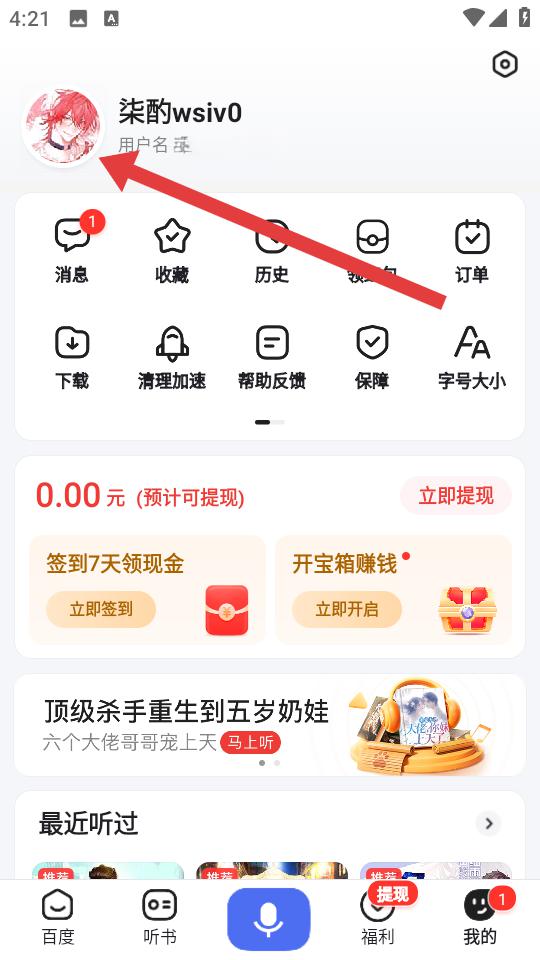 1、打开百度畅听版我的页面,点击左上角的账号头像,进入个人的主页。