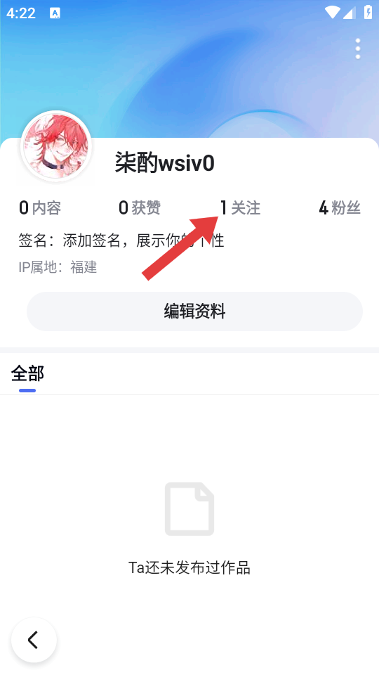 2、在个人的主页中,需要点击关注选项显示1关注处,进入关注的列表页面。