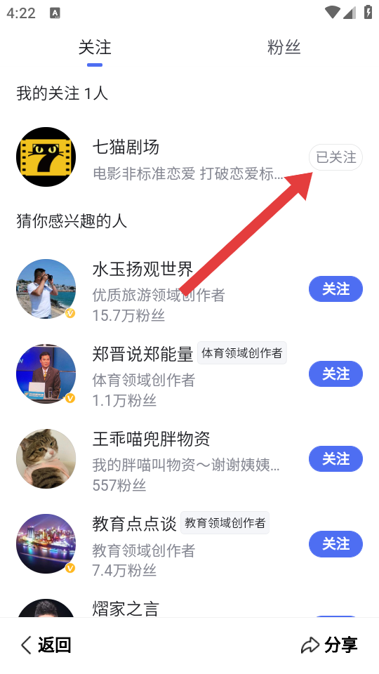 3、在关注列表中,找到要取消关注的账号如七猫剧场,点击其右侧的已关注按钮,即可取消关注。