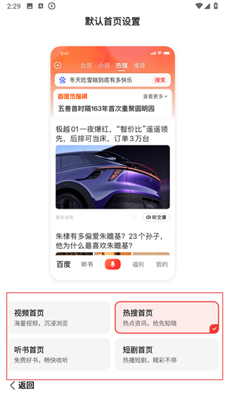 4、在默认首页设置页面里,选择想要设置的首页类型。