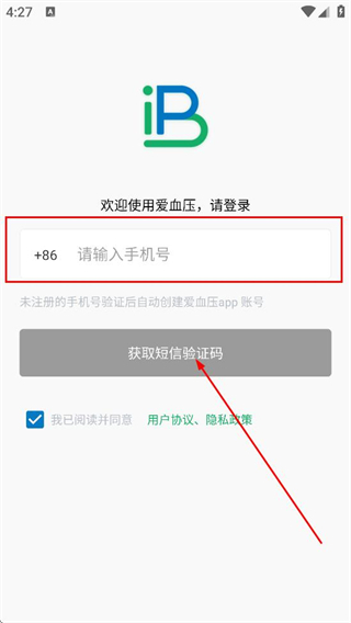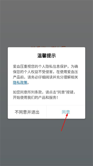 1、在温馨提示弹窗中,点击同意按钮,进入爱血压的登录页面。