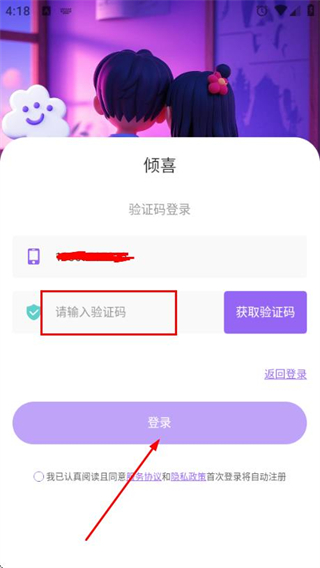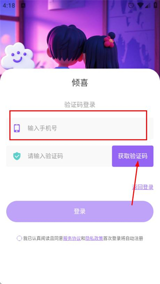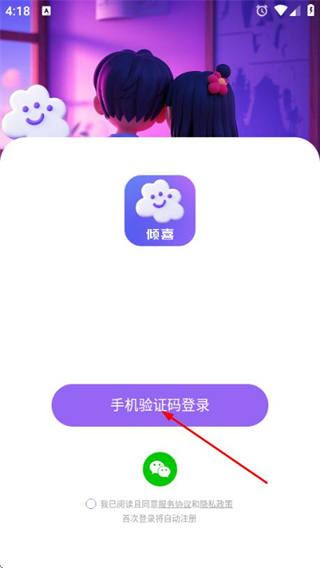 1、进入倾喜点击手机验证码登录,进入登录页面。
