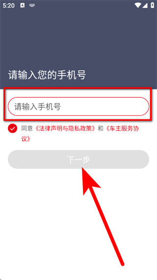 2、在手机号输入页面,填写手机号,确认已勾选协议后,点击下一步。