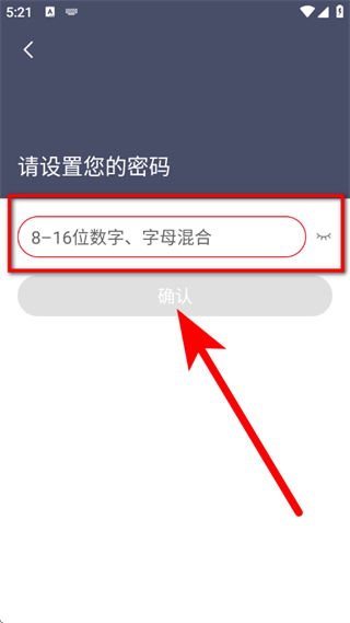 4、在设置密码页,输入8-16位数字与字母混合的密码,点击确认,完成注册操作。