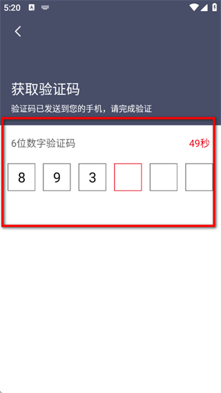 3、在获取验证码页,将收到的6位数字验证码,依次填入对应框内。