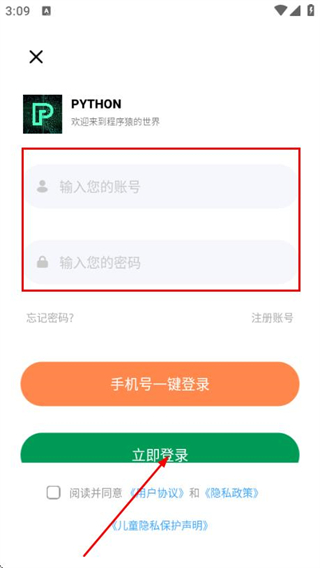 3、在登录页面填写手机号和密码,勾选协议后,点击登录完成账号登录操作。