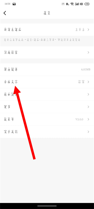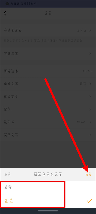 3、在设置页面,点击字体大小,弹出字体选择弹窗。