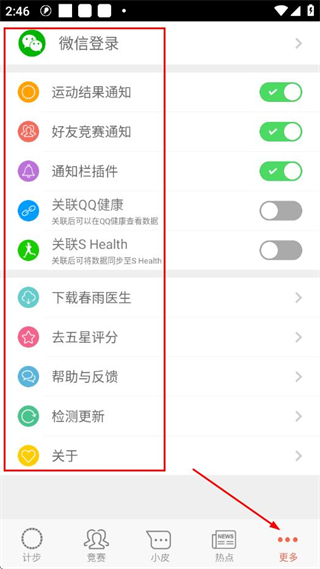5、支持微信登录,可开启运动/竞赛通知、通知栏插件,关联其他平台数据。