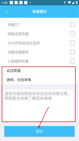 1、打开血压管家APP,在首页点击快速提问功能入口,进入病情填写页面。