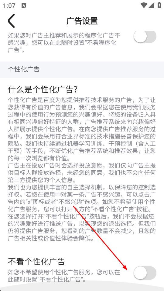 5、在广告设置页面,找到不看程序化广告选项,点击右侧的开关将其关闭。