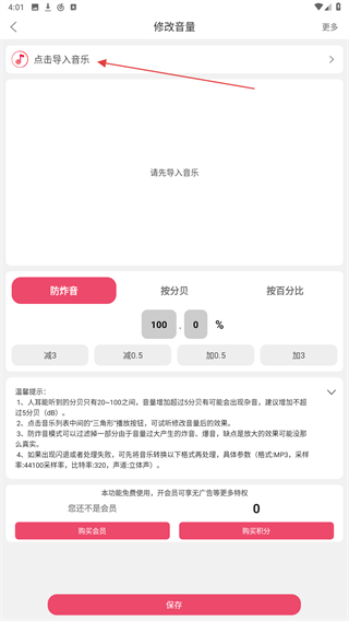 3、在修改音量的界面内,点击导入音乐的按钮。